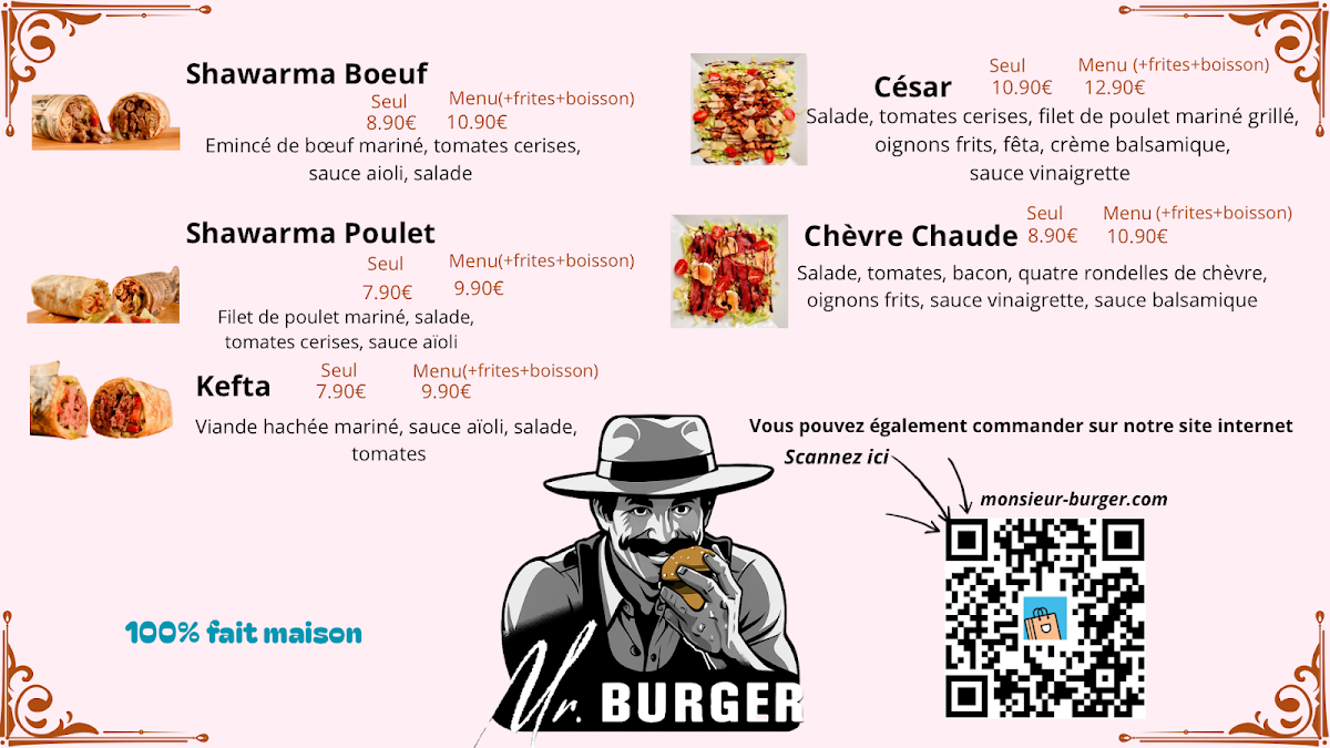 Beyond burgers, Mr BURGER offers flavorful shawarmas with marinated beef or chicken, all accompanied by crisp salads and zesty aioli. The salads themselves, like the César with grilled marinated chicken and feta or the Chèvre Chaude with warm goat cheese and bacon, balance freshness and indulgence seamlessly.